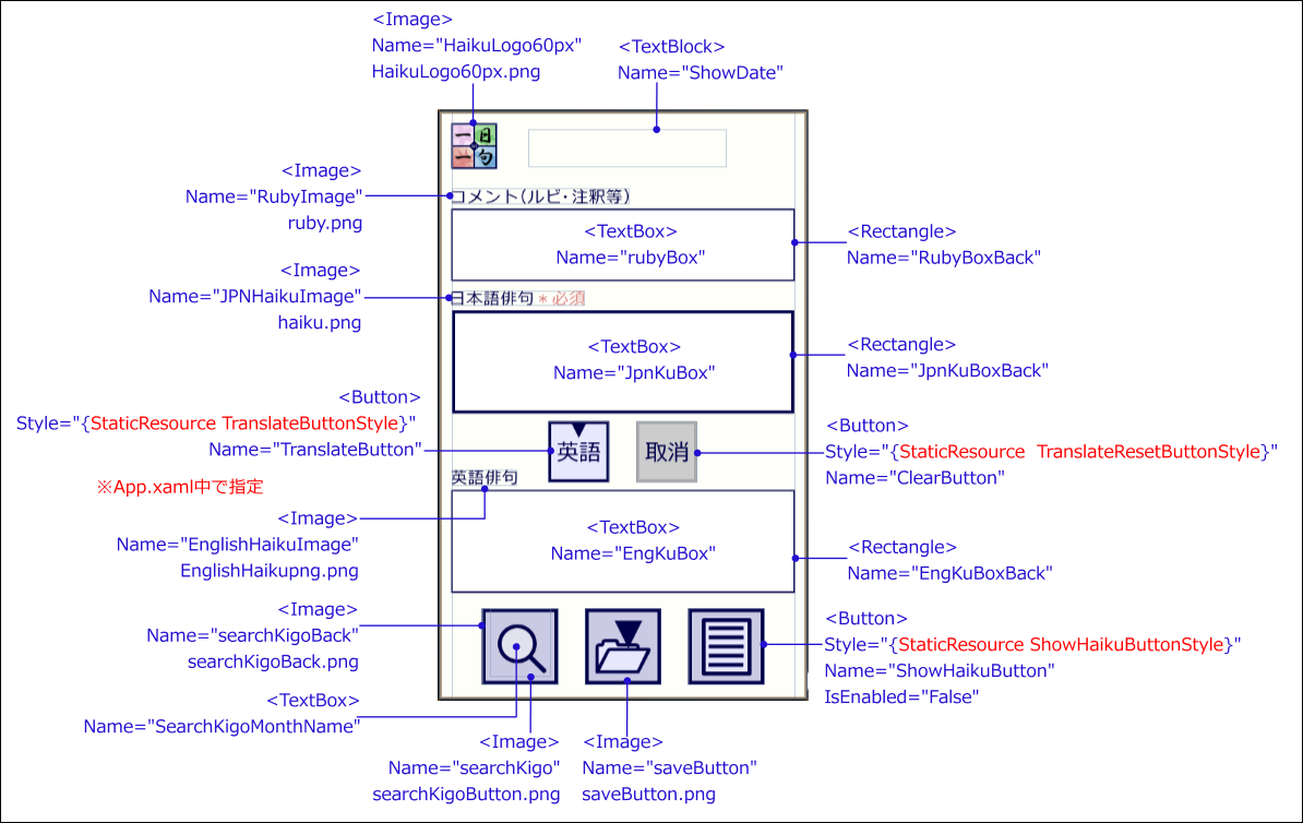 この中で、「一覧」ボタンは、ImageコントロールではなくButtonコントロールを使います。このボタンは俳句が記録されていない場合は機能させないので、IsEnabledにFalseを指定する必要があるからです。また、「翻訳」「取消」についても、ここではButtonコントロールを使っています。