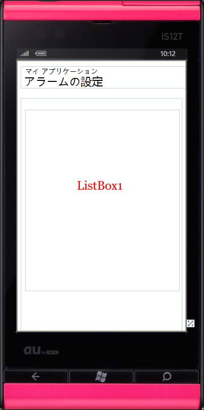PageTitleのTextプロパティには「アラームの設定」と指定します。TextBlockのStyleプロパティに指定されているPhoneTextTitle1Styleでは、文字サイズが大きすぎるので、PhoneTextTitle2Styleを指定します。