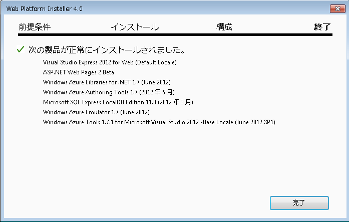 インストール完了後、WebPIが自動的に起動しますので、インストールする製品を選択します。今回はVS Express for Webを使用しますので、下記のアイテムをインストールします(2012年9月2日現在)。
