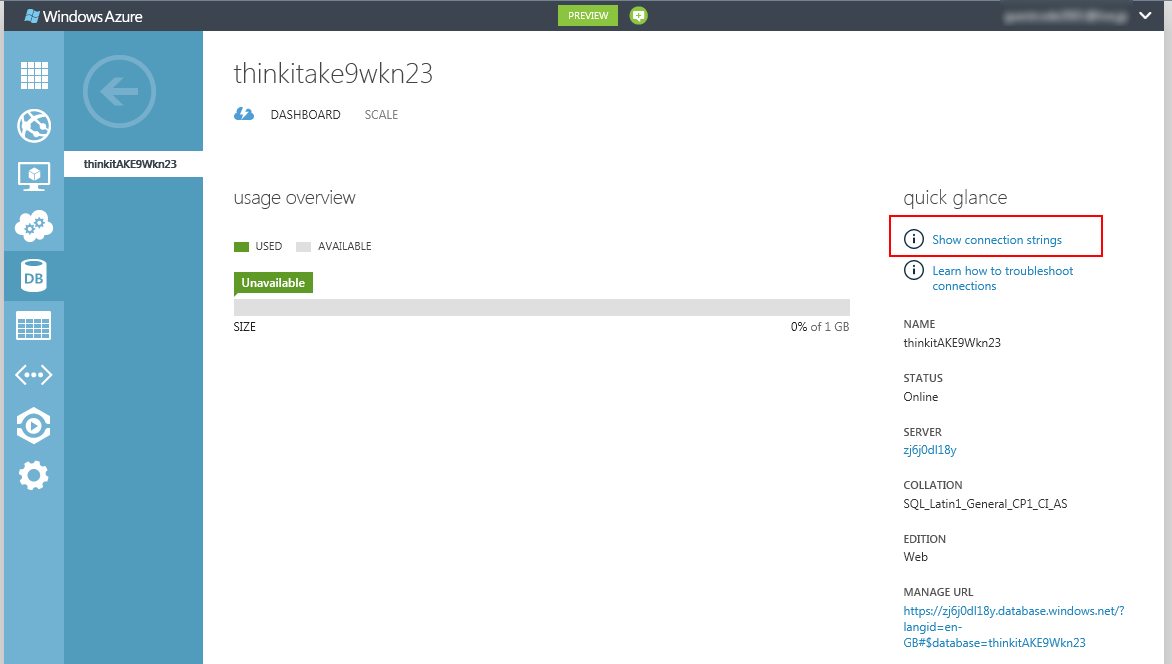 管理ポータルにアクセスし、先ほど作成したSQL データベースのDASHBOARDページの右側にある[Show connection strings]をクリックします(画面08)。