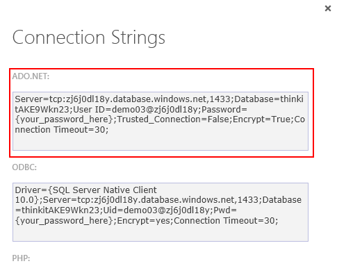 <add name="DefaultConnection" connectionString="Server=tcp: xxxx.database.windows.net,1433;Database=thinkitAKE9Wkn23;User ID=demo03@ xxxx;Password=P@ssw0rd;Trusted_Connection=False;Encrypt=True;Connection Timeout=30;MultipleActiveResultSets=True" providerName="System.Data.SqlClient" />