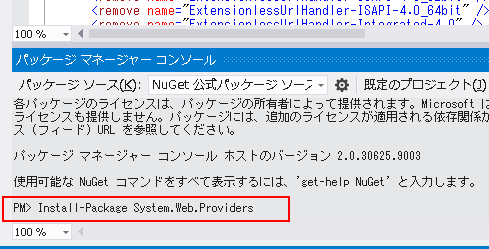 ASP.NET Universal Providersはパッケージ・マネージャ「NuGet」を使って簡単にインストールできます。VS Express for Webのメニューから[ツール]→[ライブラリパッケージマネージャ]→[パッケージマネージャコンソール]と選択し、パッケージマネージャコンソール起動後、「Install-Package System.Web.Providers」コマンドを実行すればインストール完了です(画面10)。