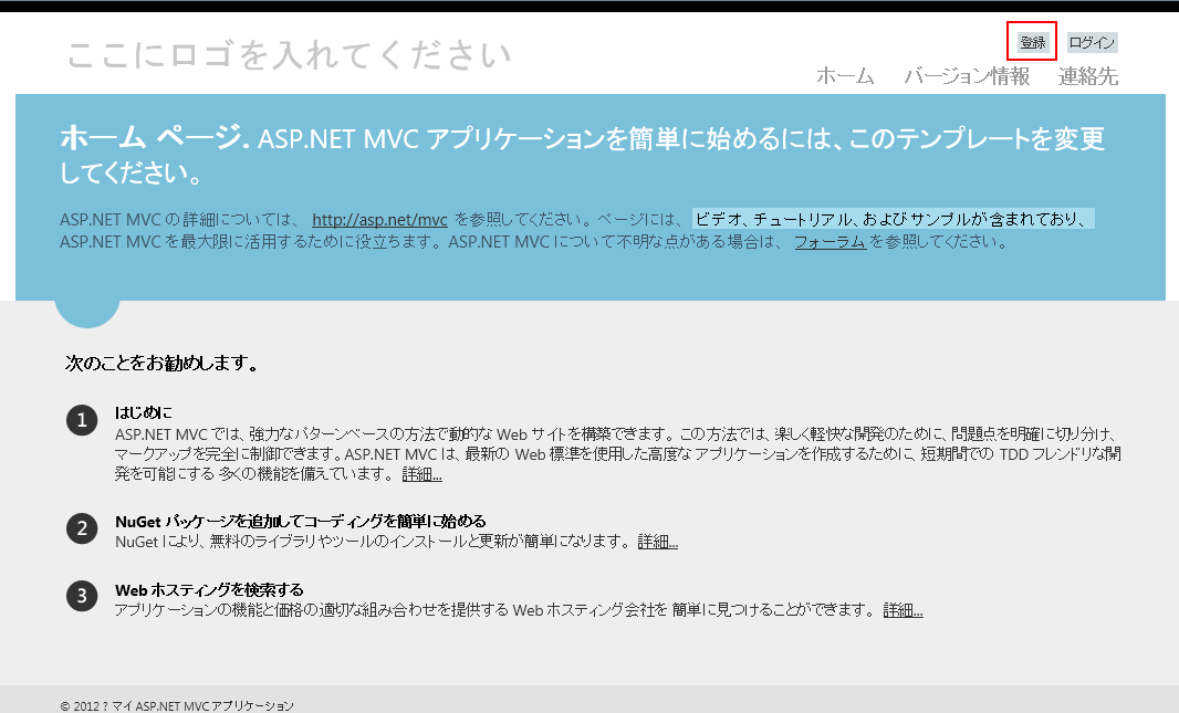これで設定は終わりです。まずは、ローカルで実行してみます。デバッグ実行するとブラウザが起動しますので、右上の[登録]をクリックしてアカウントを作成し、ログインします(画面11)。アカウントの登録やログインが問題なくできれば完了です。