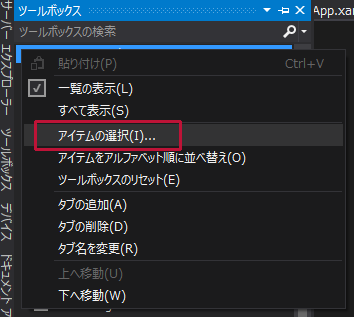 コントロールを配置する前に、ツールボックスにWinRT XAML Toolkitに含まれているコントロールを追加しておきましょう。ツールボックスの「コモンXAMLコントロール」のタブ上でマウスの右クリックをします。すると、「アイテムの選択(I)」が表示されますので、これをクリックします(図9)。