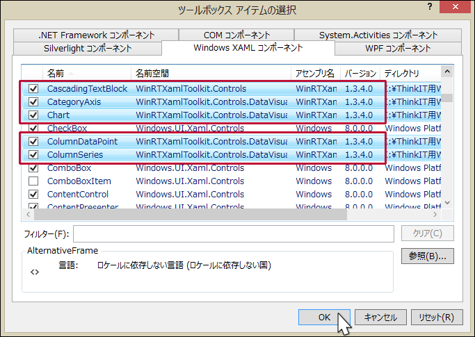 WinRtXAMLToolkit.dllが表示されますので、これを選択して[開く(O)]をクリックします。するとWinRT XAML Toolkitに含まれるコントロールが表示されチェックが付きます。[OK]ボタンで閉じます(図10)。