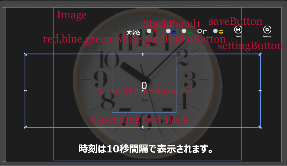 <Controls:CountdownControlx:Name="CountdownControl1" HorizontalAlignment="Left" Height="276" Margin="527,247,0,0" VerticalAlignment="Top" Width="317" Seconds="10" FontFamily="Meiryo UI" FontSize="72"/>■(8)