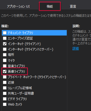 今回のサンプルは、ピクチャライブラリ内にアクセスしますので、「画像ライブラリ」へのアクセス許可が必要になります。ソリューションエクスプローラー内にpackage.appxmanifestというファイルがありますので、このファイルをダブルクリックします。「機能」タブをクリックして、表示される画面の「機能:」にある、「画像ライブラリ」にチェックを付けます(図13)。