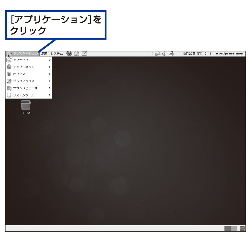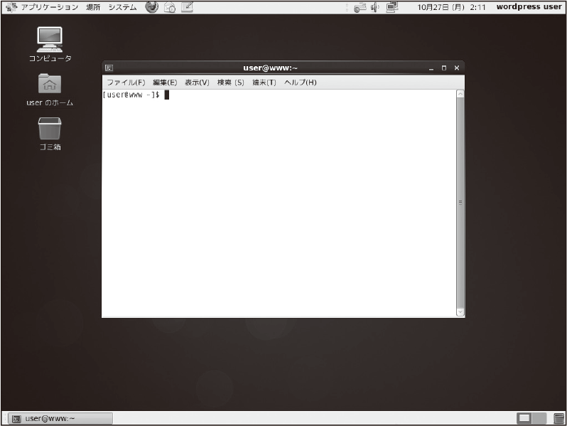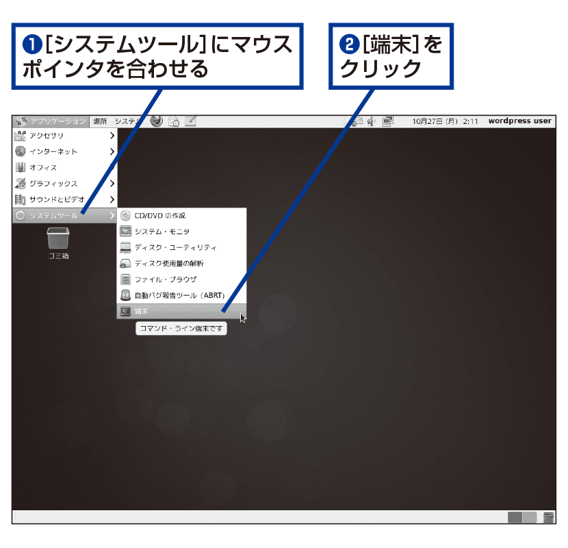 端末はよく使うツールなので、デスクトップにアイコンを表示しておくと便利です。それには、[アプリケーション]メニューを表示し、[システムツール]−[端末]を右クリックして、[このランチャをデスクトップへ追加]をクリックします。デスクトップに[端末]のアイコンが表示され、ダブルクリックで起動できるようになります。