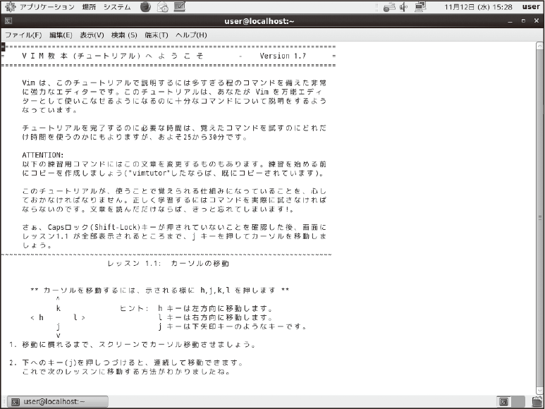 本書では、設定ファイルの編集に、viというスクリーンエディタを利用しています。viは、キーボードのホームポジションで操作がしやすいようになっていることや、コマンドモードとテキストモードという2つのモードがあるのが、特徴といえるでしょう。コマンドモードはviに対する命令を実行するモードで、入力された文字は、viに対するコマンドとして受け取られます。それに対してテキストモードは、テキストの入力、編集を行うモードです。CentOS 6.xでは、viクローンのvim(vi improved)にエイリアスされています。vi起動時にヘルプを参照するには、「:help」、コマンドラインで参照するには、「man vim」と入力してください。また、vimには、有用なチュートリアルも用意されています。コマンドラインで「vimtutor」と入力すると、右の画面が表示されます。初めてviを使う方は、このチュートリアルを利用されるとよいでしょう。